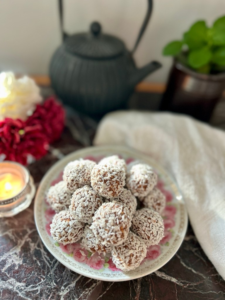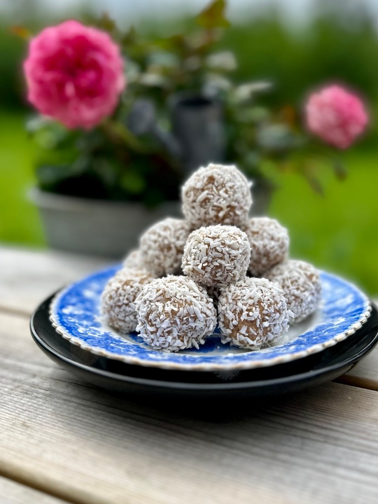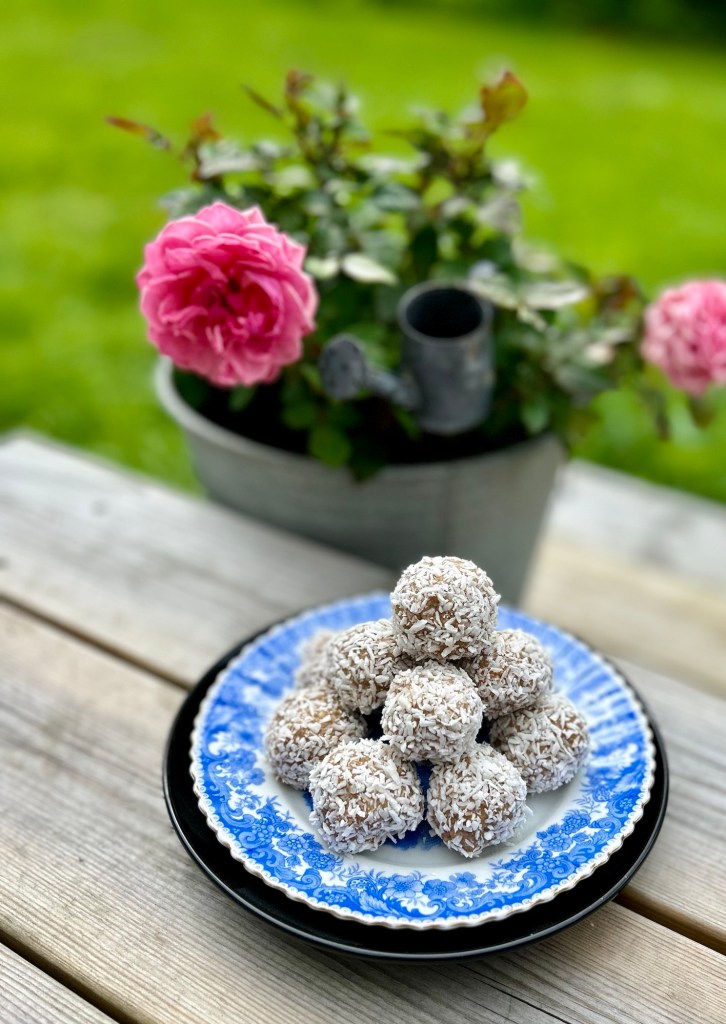 – Vispa ihop smör och socker, tillsätt resten av ingredienserna och vispa ihop ordentligt, jag använde elvisp – Rulla till bollar och rulla i kokos, pärlsocker eller strössel