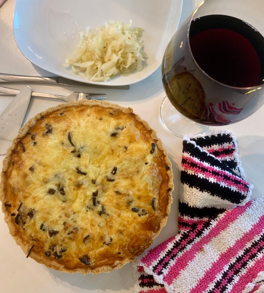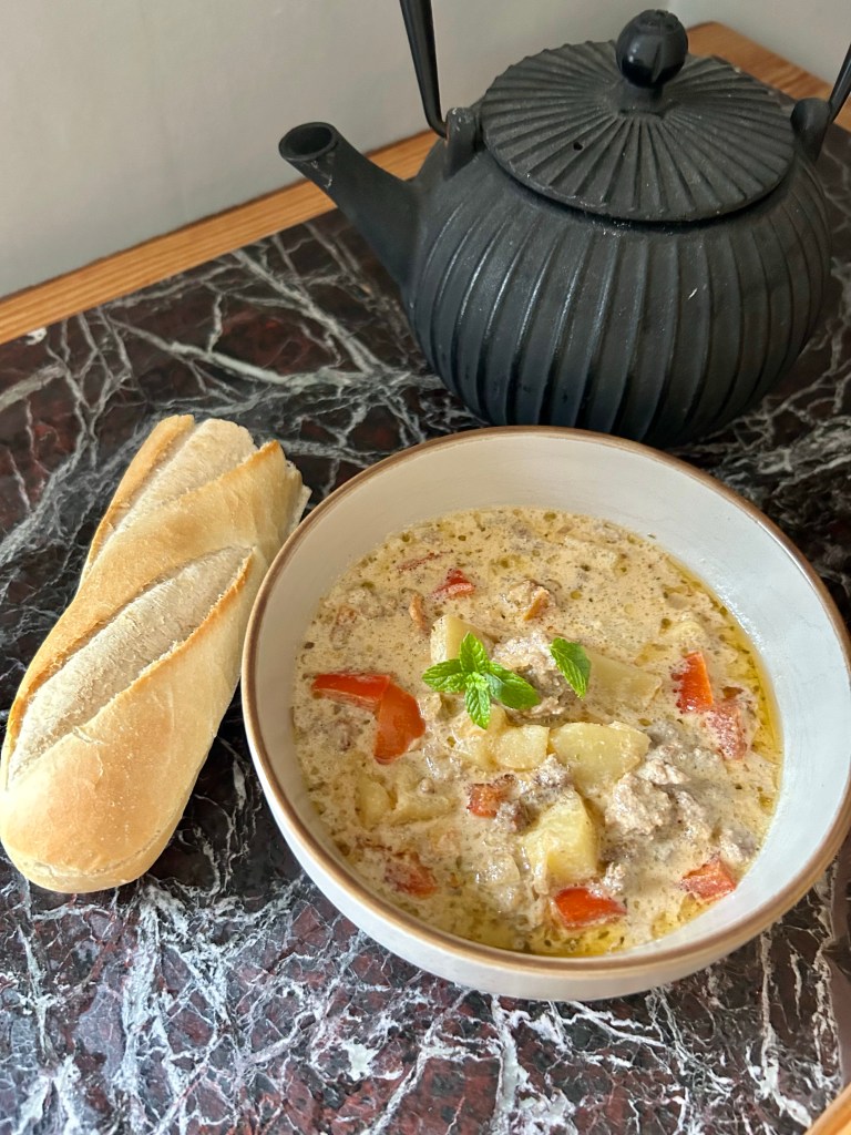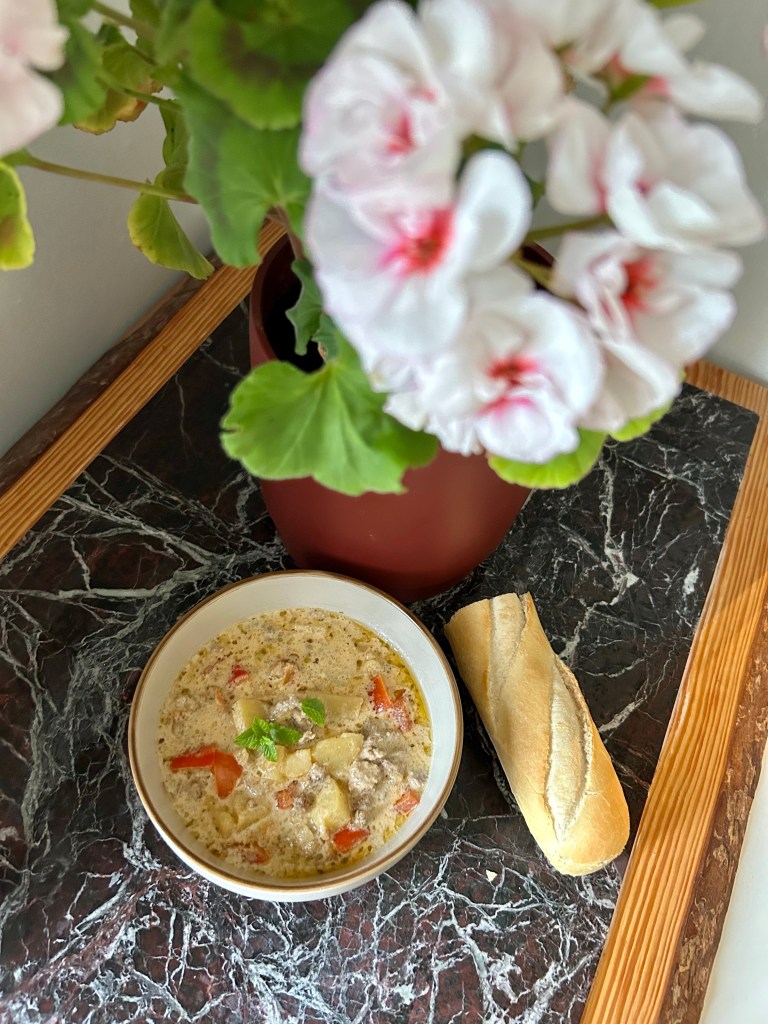 – Mixa löken med vattnet (om du gjort fläsklägg så använd kokspadet från det), lägg i buljongtärningen och lite vitpeppar, koka upp